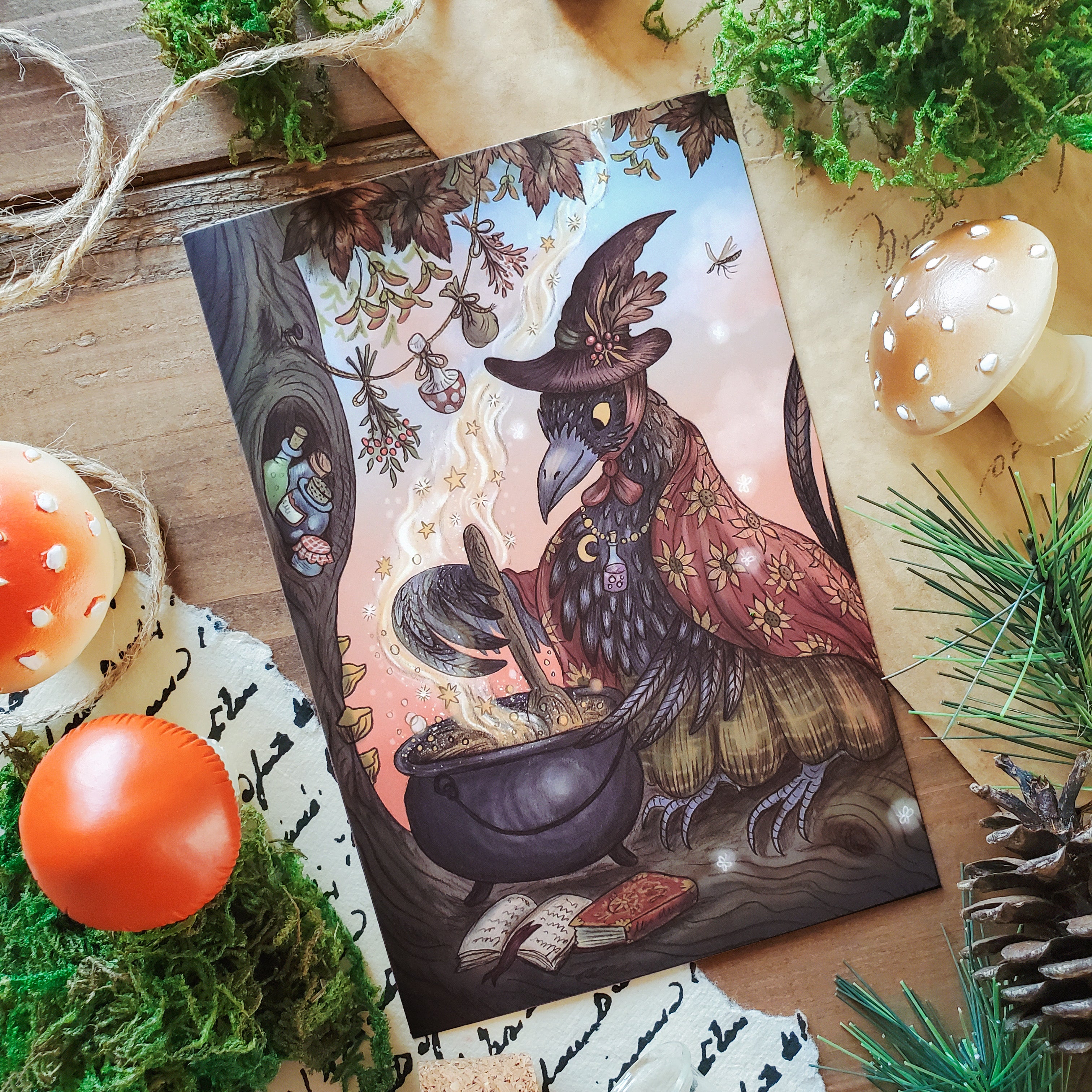 🧙🐦 Deep within a cozy woodland hollow, a wise little crow-witch brews starlit magic beneath a rosy twilight sky. Surrounded by potion bottles, fluttering fireflies, and ancient spellbooks, this enchanting scene by @freyahartas captures the heart of forest folklore. This feathered sorcerer stirs up shimmering spells that drift like constellations through the trees — a perfect touch of whimsy for anyone who believes in woodland wonders.