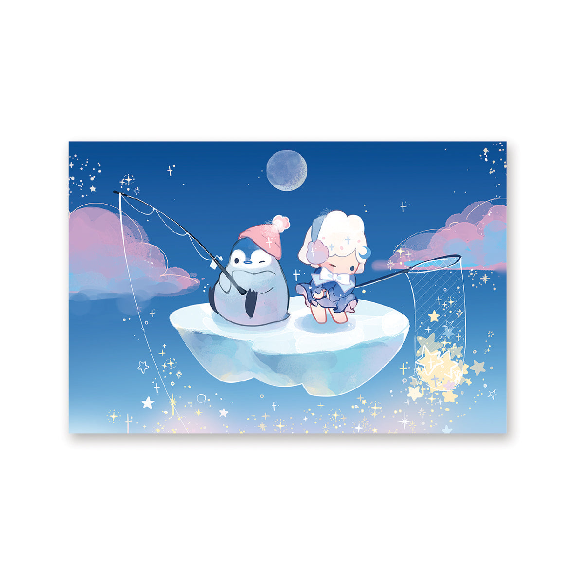 ✨🎣 Drift into dreamland with this whimsical postcard by @califlair featuring a fluffy friend and a cozy penguin fishing for stars in the sky! With a sprinkle of sparkles, pastel skies, and a moonlit glow, it’s the perfect way to send a little stardust and joy to someone special.