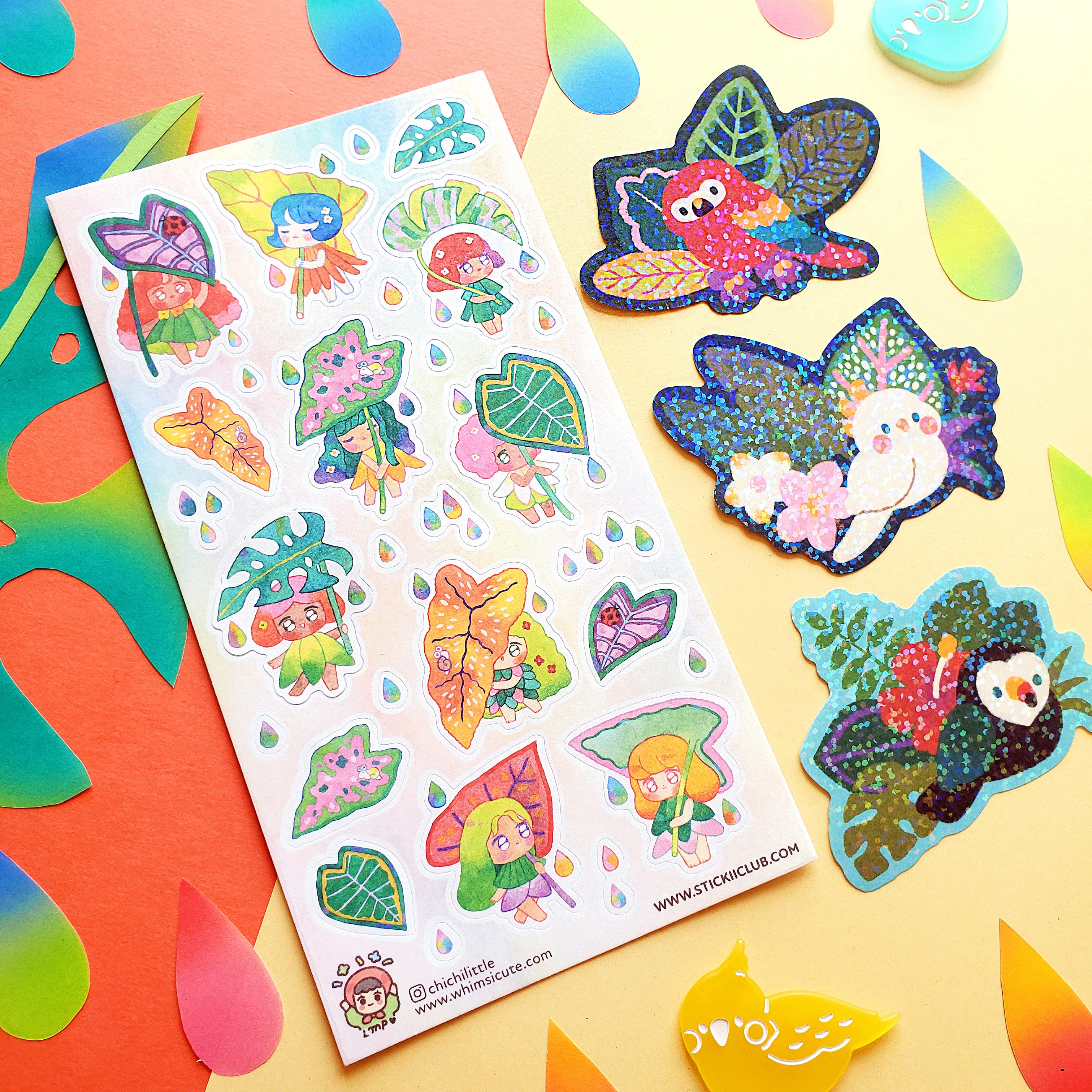 🌿💧 Wearing flower dresses, @chichilittle’s tropical girls are all about that rainforest life and are taking shelter from the rain under leafy umbrellas! This kawaii set will brighten up any page with a splash of tropical vibes.