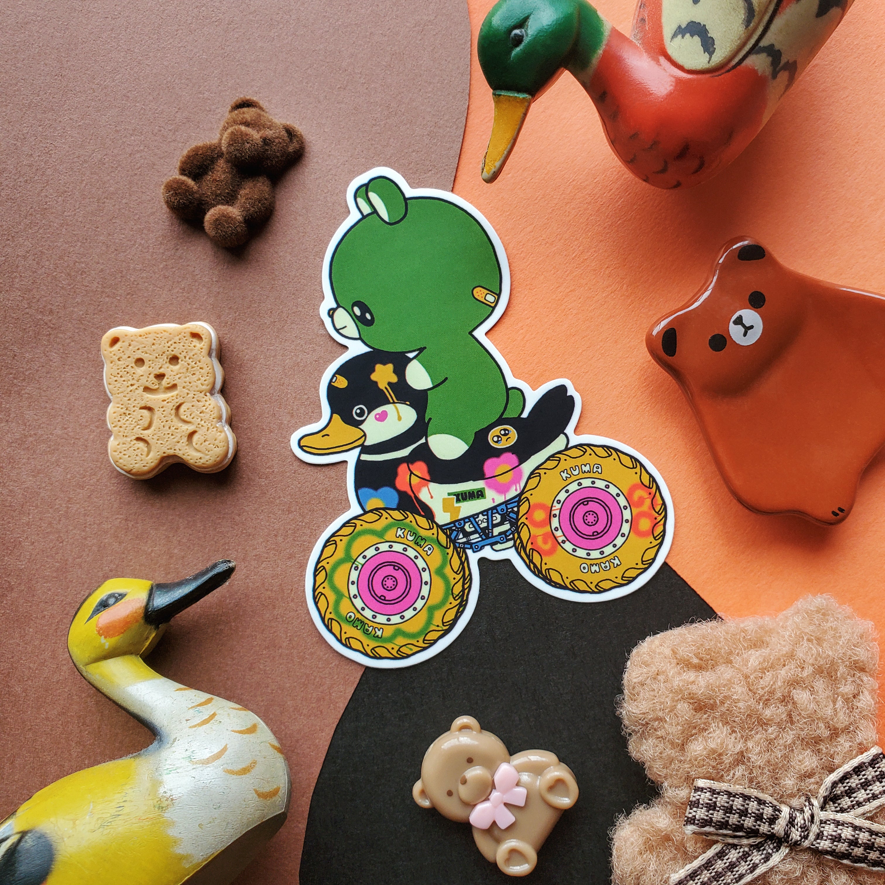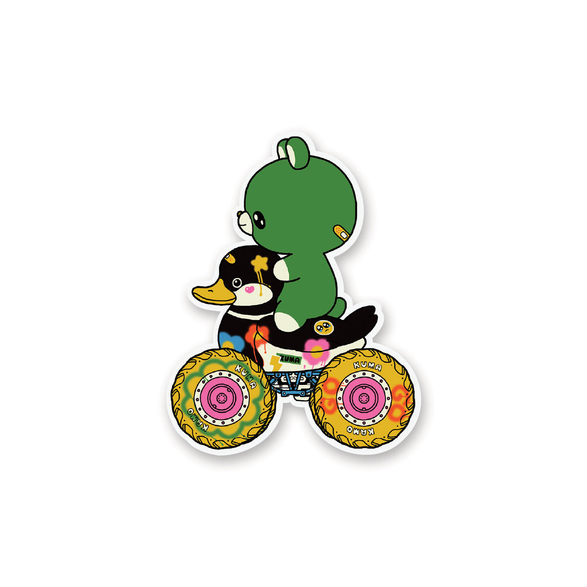 🏍🐻 Roll into good vibes with this delightfully quirky sticker by @guugorou. A little green bear hitches a ride on a paint-splattered motorcycle duck, cruising on chunky, candy-colored wheels. This fun-loving duo is all about self-expression, forward motion, and loving the ride, bumps and all.
