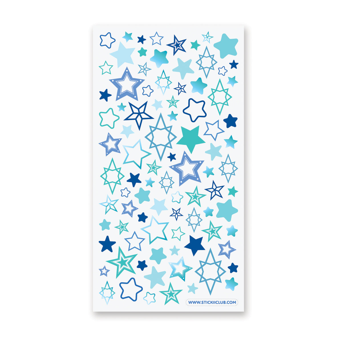 🌟 Twinkling in the sky, we bring you a sheet full of blue stars in many different designs and sizes. Similar to paper lanterns lit-up at nighttime, use this set to add a fun sparkle and light up any page.