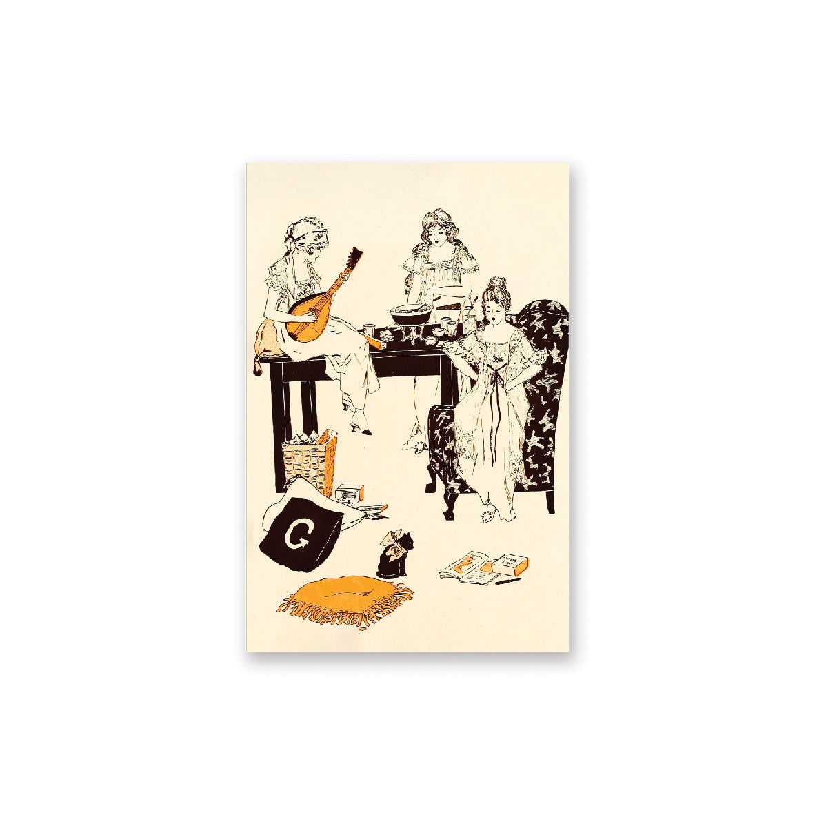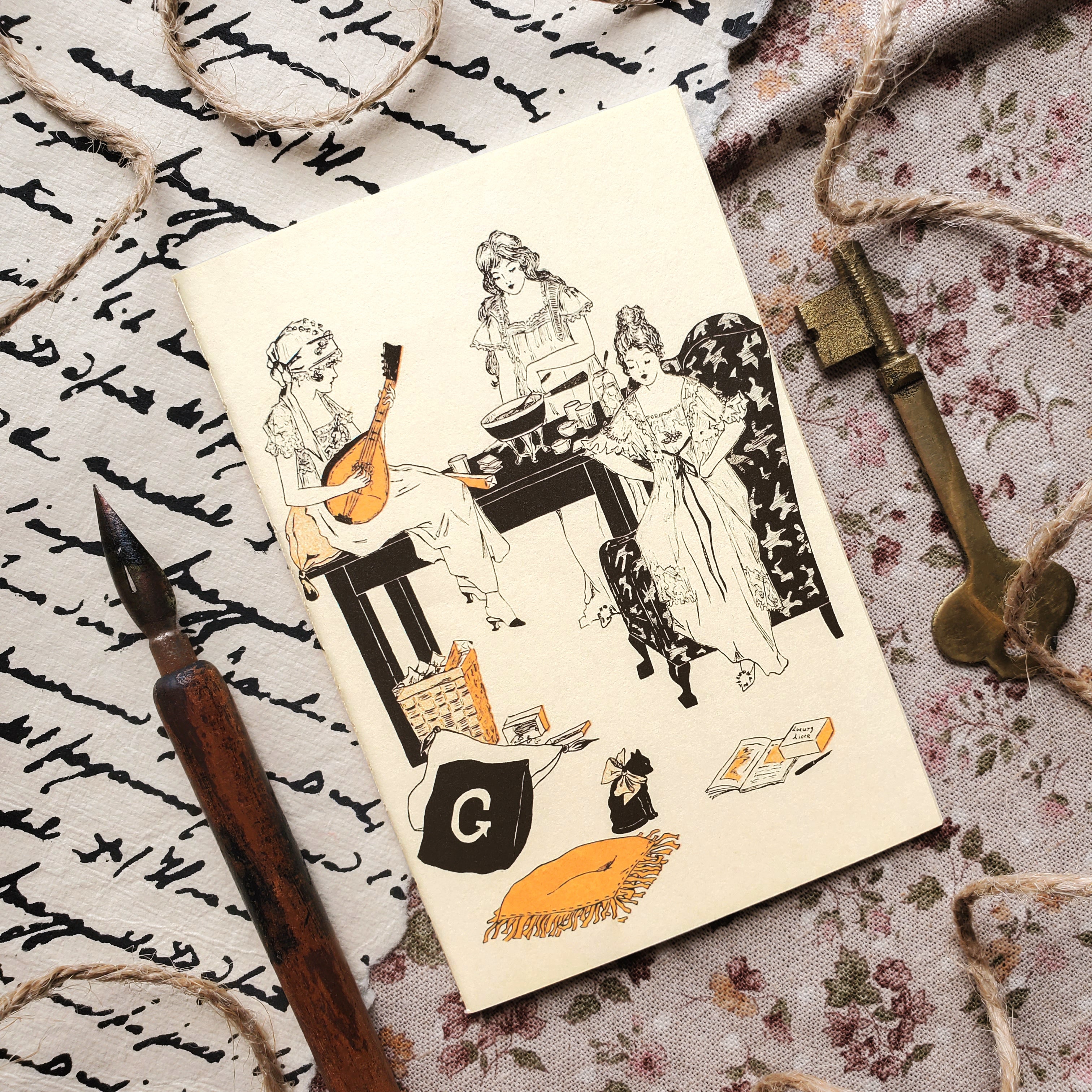📝 This charming pocket companion features a delightful vintage illustration that transports you to a bygone era of refined leisure. Featuring three ladies enjoying a sophisticated afternoon together – one playing a lute, another preparing tea, while the third sits gracefully in a patterned chair, this design evokes the timeless appeal of classic book illustrations.