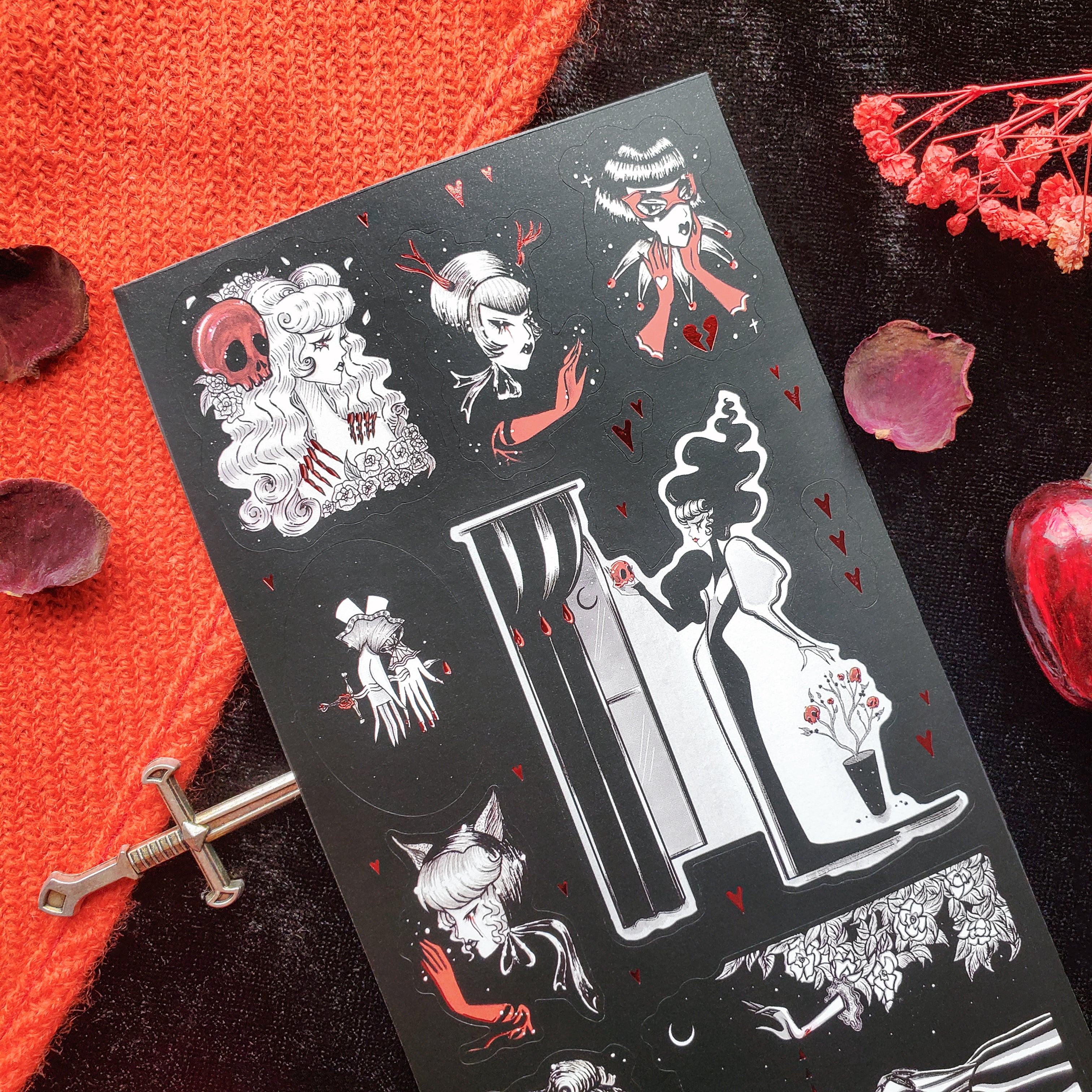 🖤🥀 Let your valentine know how your black heart beats for them with @stefanirabideaux’s stunning dark gothic Valentine set. Glamorous ladies, crimson gloves, skulls, and roses drift beneath a star-speckled night. With gleaming foiled hearts that shimmer like stardust, this striking sheet celebrates love at its most dramatic, decadent, and enduring.