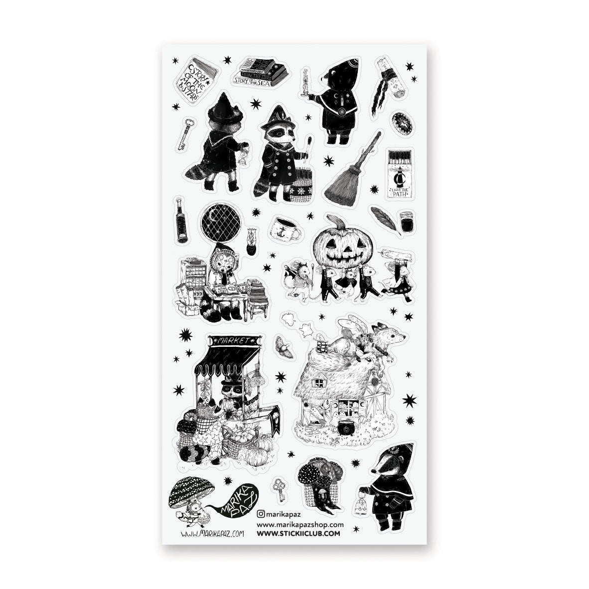 🕯️🦝 Wander into a mysterious little village where masked wanderers, pumpkin parades, potion sellers, and enchanted creatures gather beneath star-speckled skies. Filled with storybook characters, magical markets, cozy cottages, and curious nighttime rituals, this beautifully illustrated sheet by @marikapaz feels like a page pulled from a spooky fairytale. With rich vintage textures and whimsical details, every sticker invites you to explore a world where magic lingers in every shadow and wonder waits around every corner.