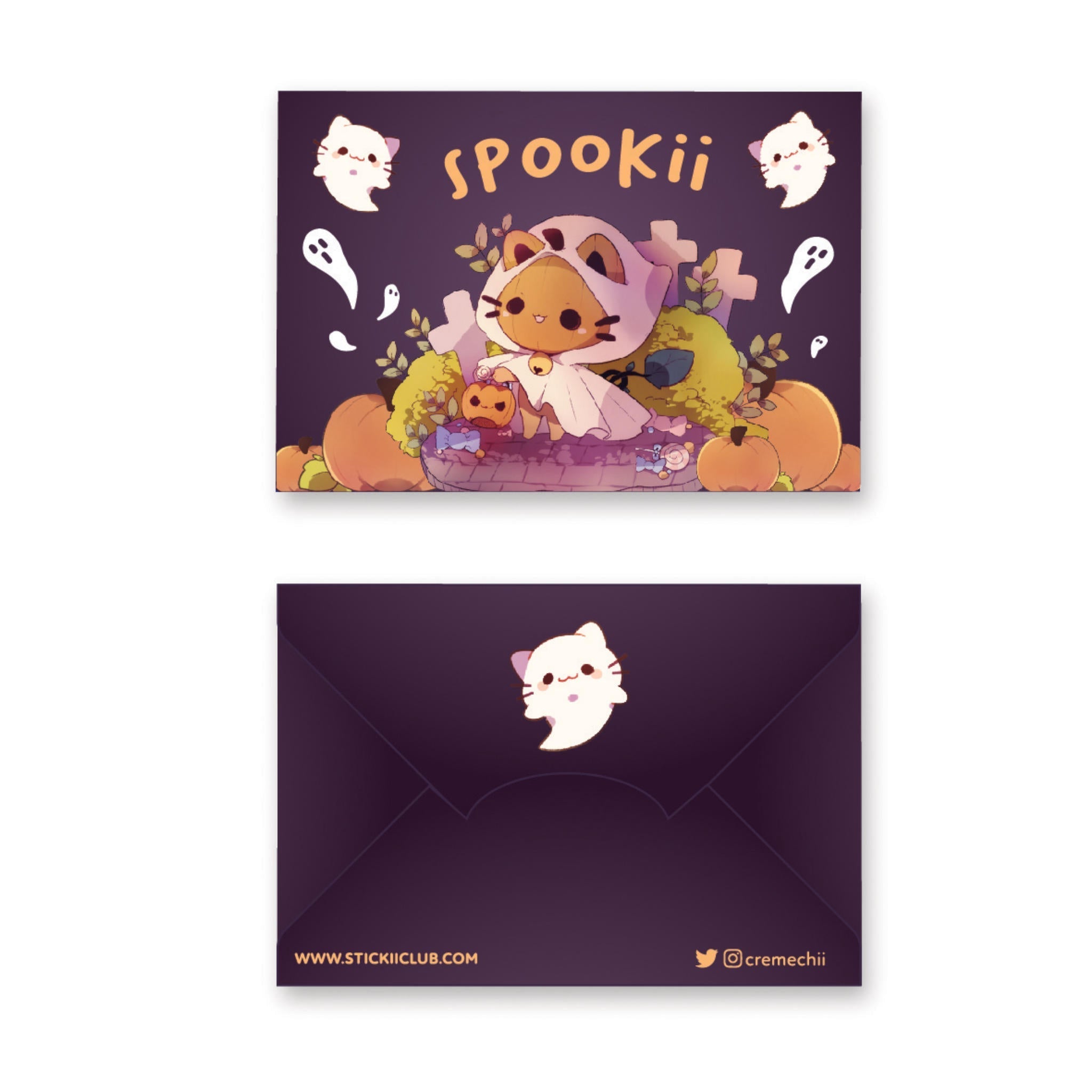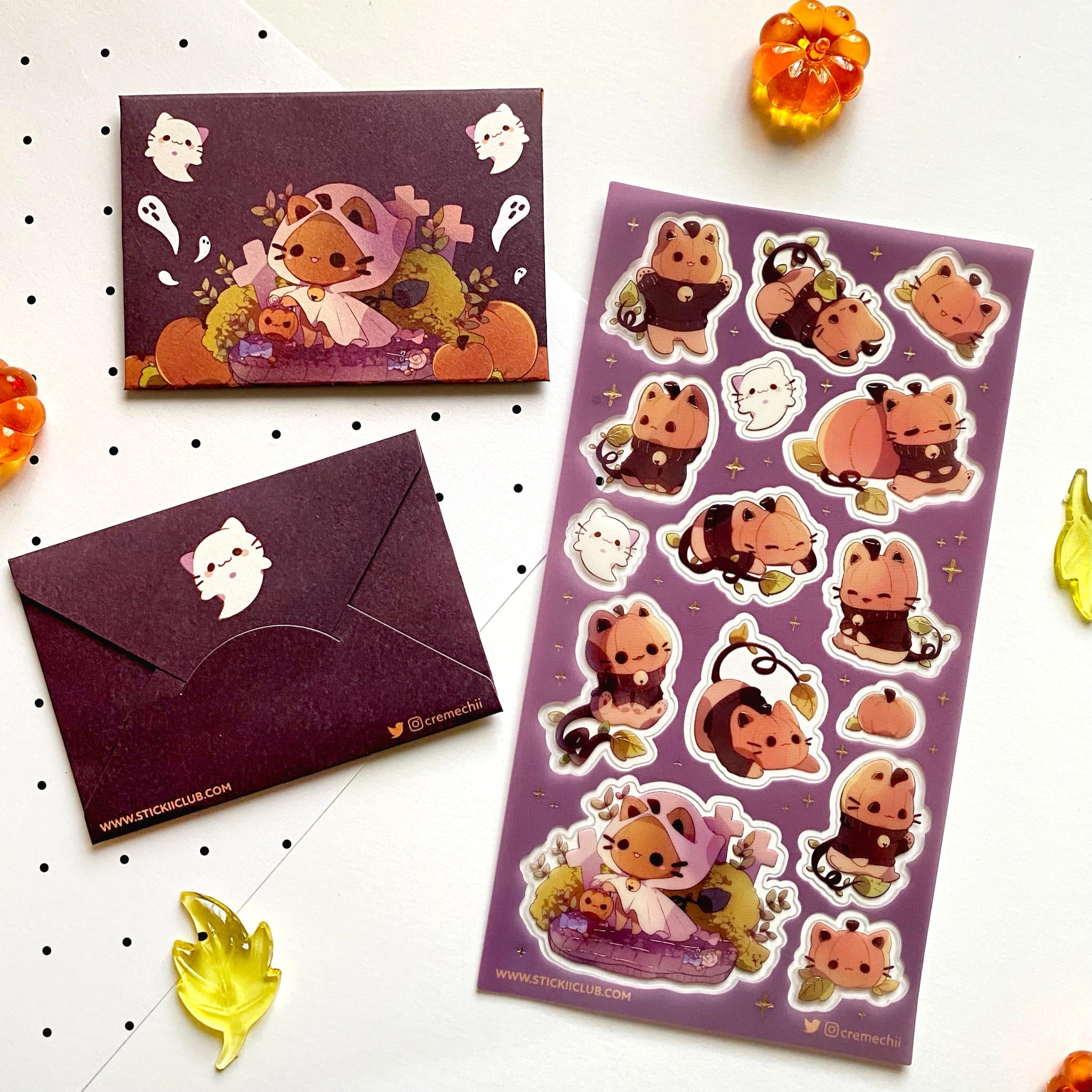 ¡Un sobre con un gatito paseando en la noche de Halloween acompañado de algunos espíritus amigables! 🐈 👻