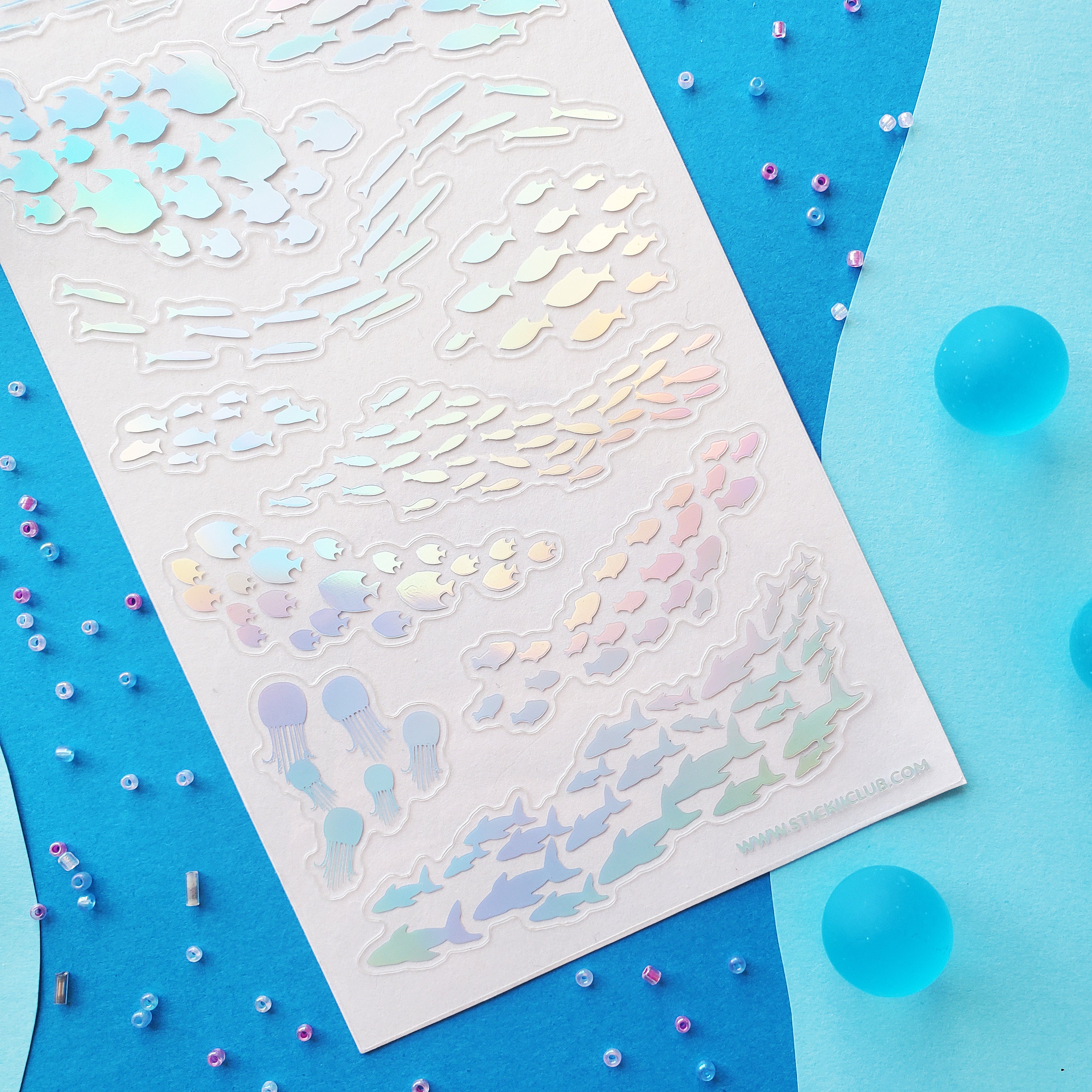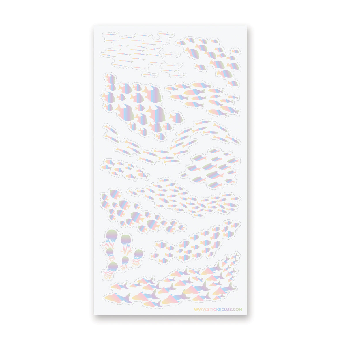 🐠 ¡No puedes sumergirte bajo las olas sin ver toneladas de peces! Brillando en papel holográfico, este conjunto de cardúmenes de peces nadan juntos en perfecta armonía. ¡Deja que estos brillantes peces te guíen y sean tus guías submarinos!