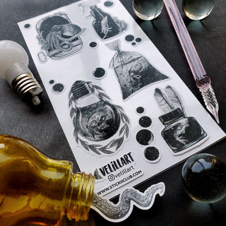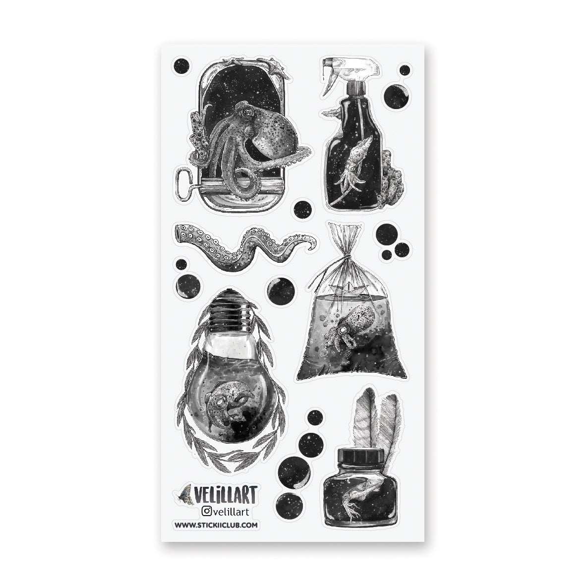🦑💡 The deep blue – dark, brimming with mystery, and utterly fascinating! Behold the majestic squid, a master of camouflage, brought to life by @velillart’s awesome b&w designs. From a squid ink bottle to a lightbulb, this set of squids in their unique abodes blends fantasy with the real-life wonders of the sea.
