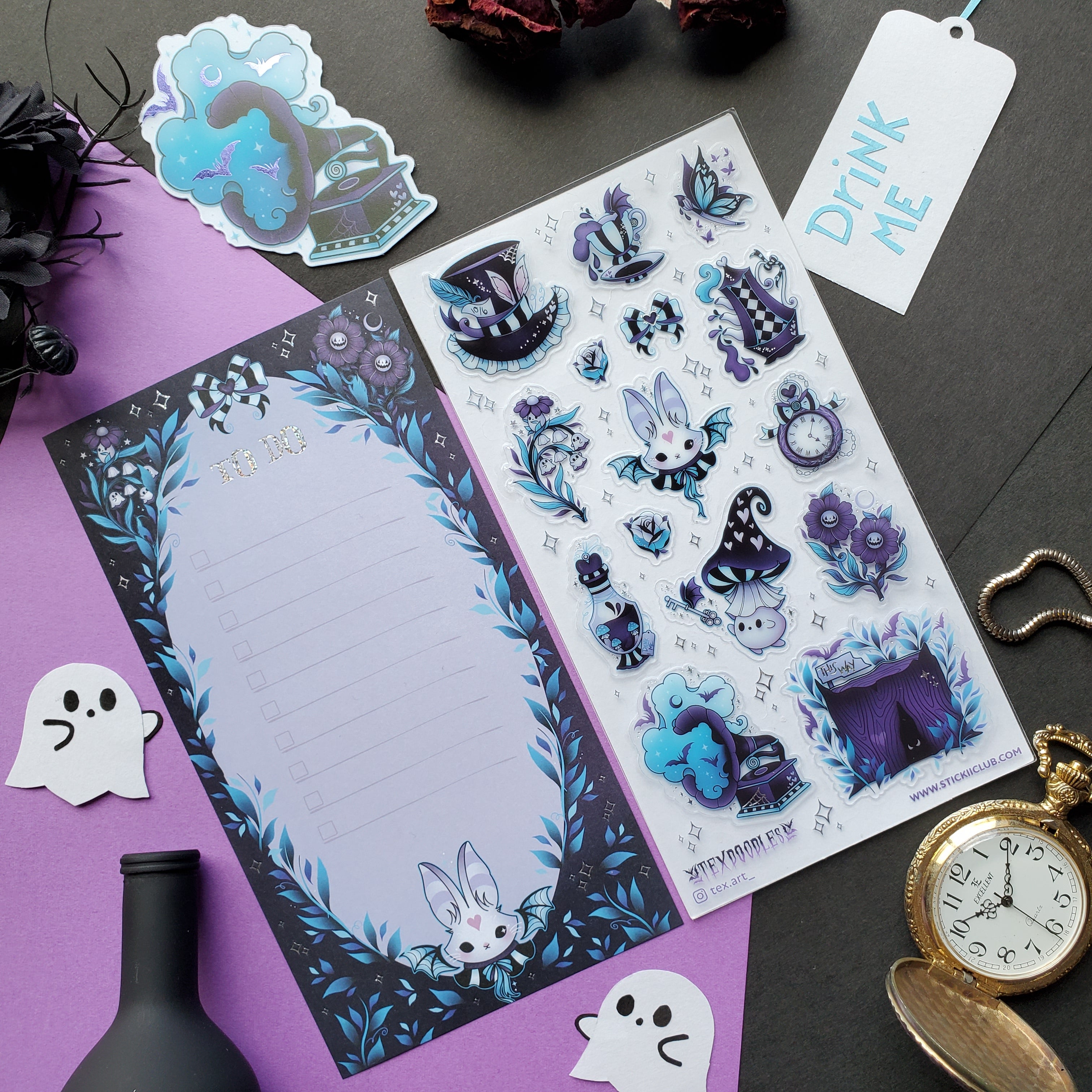 🐰 Ya sea que tengas un juego de croquet a las 3 o una fiesta de té a las 6, estas hojas de notas de @tex.art_ te ayudarán a mantenerte organizado en el mundo de las pegatinas y en la vida cotidiana. Con una versión gótica del clásico White Rabbit, nunca llegarás tarde a ninguna cita con este set.