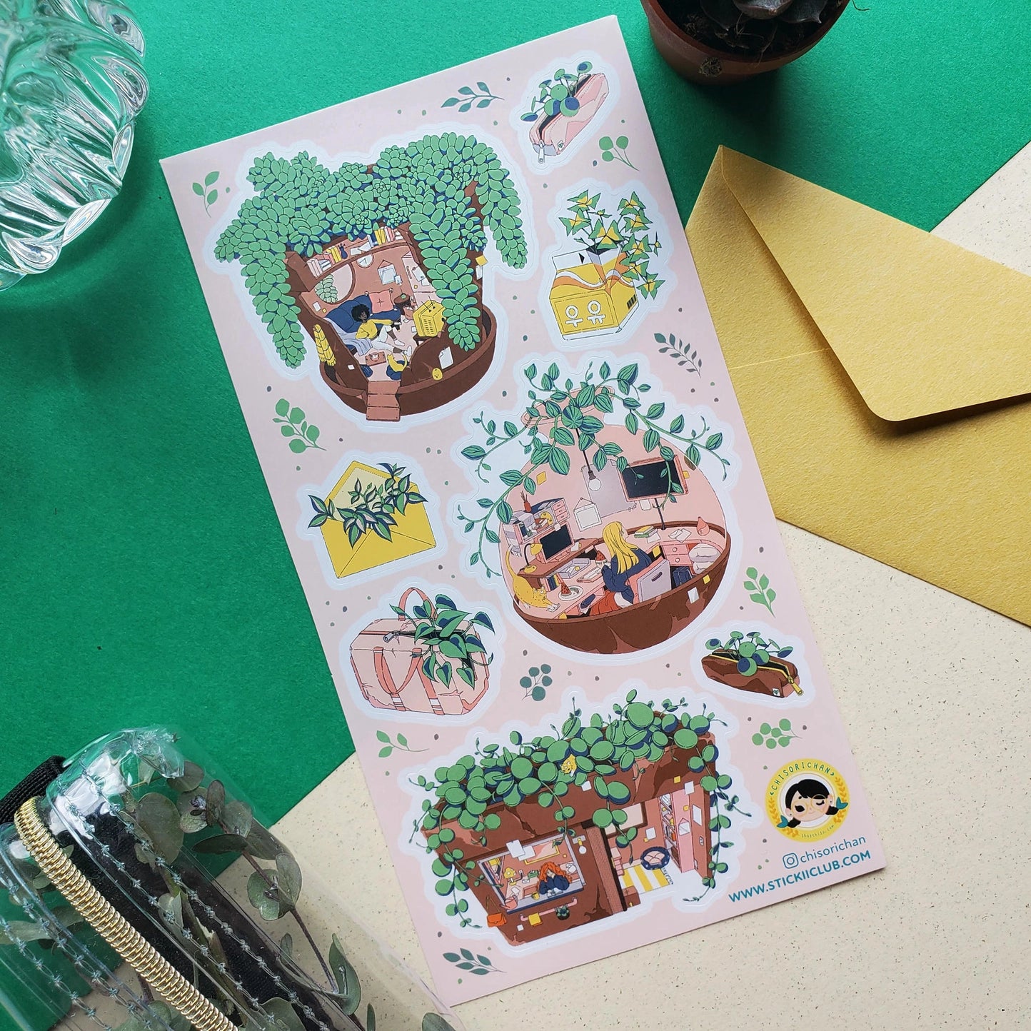 @chisorichan ‘s flowerpot homes with succulents and airplants as roofs. Share the life with friends by using the stamp of a few leaves tucked into an envelope!